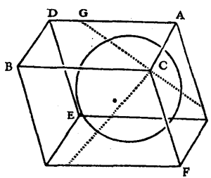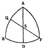 It was stated, in Article 26, that the straight line CS, which in the preceding figure is CH, being the axis of the crystal, that is to say being equally inclined to the three sides CA, CB, CF, the angle GCH is 45 degrees 20 minutes. This is also easily calculated by the same spherical triangle. For by drawing the other arc AD which cuts BF equally, and intersects FQ at S, this point will be the centre of the triangle. And it is easy to see that the arc SQ is the measure of the angle GCH in the figure which represents the crystal. Now in the triangle QAS, which is right-angled, one knows also the angle A, which is 52 degrees 30 minutes, and the side AQ 50 degrees 56 minutes; whence the side SQ is found to be 45 degrees 20 minutes.