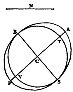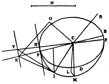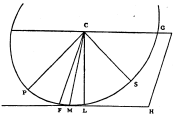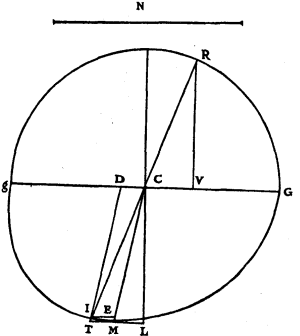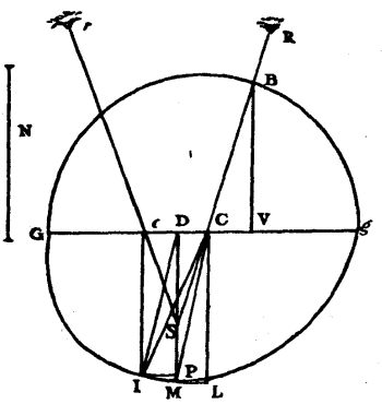 In Article 27 it was required to show that PMS being an ellipse the centre of which is C, and which touches the straight line MD at M so that the angle MCL which CM makes with CL, perpendicular on DM, is 6 degrees 40 minutes, and its semi-minor axis CS making with CG (which is parallel to MD) an angle GCS of 45 degrees 20 minutes, it was required to show, I say, that, CM being 100,000 parts, PC the semi-major diameter of this ellipse is 105,032 parts, and CS, the semi-minor diameter, 93,410.