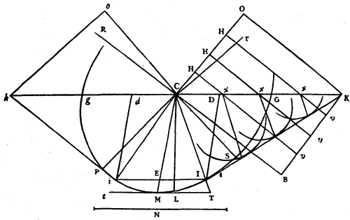 Similarly, because the angle OMZ is equal to CDZ, or LCZ, which is 44 degrees 40 minutes, being the complement of GCS, it follows that, as the radius of the Tables is to the tangent of 44 degrees 40 minutes, so will OM 78,079 be to OZ 77,176. But OC is 62,479 of these same parts of which CM is 100,000, because it is equal to MN, the sine of the angle MCP, which is 38 degrees 40 minutes. Then the whole line CZ is 139,655; and CS, which is a mean proportional between CZ and CO will be 93,410.