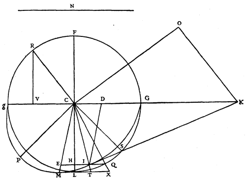 Let CP and CS be prolonged and meet the tangent DM at D and Z; and from the point of contact M let MN and MO be drawn as perpendiculars to CP and CS. Now because the angles SCP, GCL, are right angles, the [Pg 102]angle PCL will be equal to GCS which was 45 degrees 20 minutes. And deducting the angle LCM, which is 6 degrees 40 minutes, from LCP, which is 45 degrees 20 minutes, there remains MCP, 38 degrees 40 minutes. Considering then CM as a radius of 100,000 parts, MN, the sine of 38 degrees 40 minutes, will be 62,479. And in the right-angled triangle MND, MN will be to ND as the radius of the Tables is to the tangent of 45 degrees 20 minutes (because the angle NMD is equal to DCL, or GCS); that is to say as 100,000 to 101,170: whence results ND 63,210. But NC is 78,079 of the same parts, CM being 100,000, because NC is the sine of the complement of the angle MCP, which was 38 degrees 40 minutes. Then the whole line DC is 141,289; and CP, which is a mean proportional between DC and CN, since MD touches the Ellipse, will be 105,032.