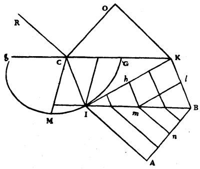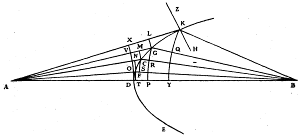 As for the manner in which Mr. Des Cartes discovered these lines, since he has given no explanation of it, nor any one else since that I know of, I will say here, in passing, what it seems to me it must have been. Let it be proposed to find the surface generated by the revolution of the curve KDE, which, receiving the incident rays coming to it from the point A, shall deviate them toward the point B. Then considering this other curve as already known, and that its apex D is in the straight line AB, let us divide it up into an infinitude of small pieces by the points G, C, F; and having drawn from each of these points, straight lines towards A to represent the incident rays, and other straight lines towards B, let there also be described with centre A the arcs GL, CM, FN, DO, cutting the rays that come from A at L, M, N, O; and from the points K, G, C, F, [Pg 115]let there be described the arcs KQ, GR, CS, FT cutting the rays towards B at Q, R, S, T; and let us suppose that the straight line HKZ cuts the curve at K at right-angles.