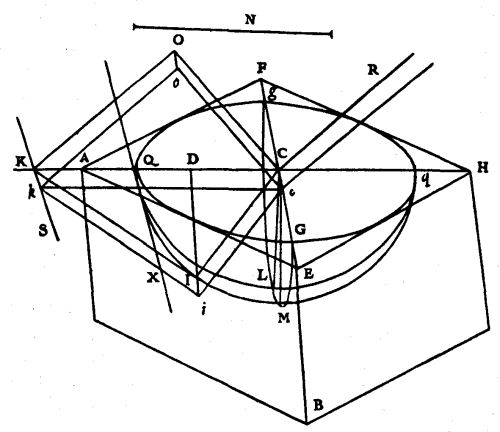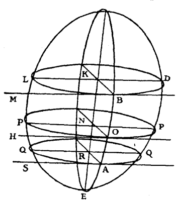Through the line BM, and through the points O and A, let there be drawn planes parallel to one another, which, in cutting the spheroid make the ellipses LBD, POP, QAQ; which will all be similar and similarly disposed, and will have their centres K, N, R, in one and the same diameter of the spheroid, which will also be the diameter of the ellipse made by the section of the plane that passes through the centre of the spheroid, and which cuts the planes of the three said Ellipses at right angles: for all this is manifest by proposition 15 of the book of Conoids and Spheroids of Archimedes. Further, the two latter planes, which are drawn through the points O and A, will also, by cutting the planes which touch the spheroid in these same points, generate straight lines, as OH and AS, which will, as is easy to see, be parallel to BM; and all three, BM, OH, AS, will touch the Ellipses LBD, POP, QAQ in these points, B, O, A; since they are in the planes of these ellipses, and at the same time in the planes which touch the spheroid. If now from these points B, O, A, there are drawn the straight lines BK, ON, AR, through the centres of the same ellipses, and if through these centres there are drawn also the diameters LD, PP, QQ, parallel to the tangents BM, OH, AS; these will be conjugate to the aforesaid BK, ON, AR. And because the three ellipses are similar and similarly [Pg 105]disposed, and have their diameters LD, PP, QQ parallel, it is certain that their conjugate diameters BK, ON, AR, will also be parallel. And the centres K, N, R being, as has been stated, in one and the same diameter of the spheroid, these parallels BK, ON, AR will necessarily be in one and the same plane, which passes through this diameter of the spheroid, and, in consequence, the points R, O, A are in one and the same ellipse made by the intersection of this plane. Which was to be proved. And it is manifest that the demonstration would be the same if, besides the points O, A, there had been others in which the spheroid had been touched by planes parallel to the straight line BM.