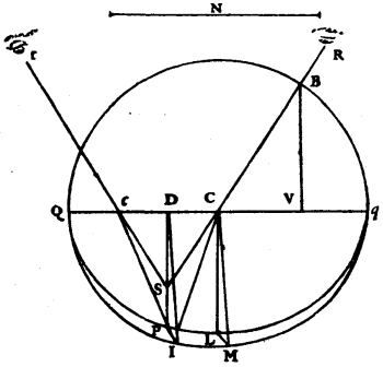 To demonstrate the effect of the curve, let there be described about the centre L the circular arc AH, cutting LG at H; and about the centre F the arc BP; and in AB let AS be taken equal to 2/3 of HG; and SE equal to GD. Then considering AH as a wave of light emanating from the point L, it is certain that during the time in which its piece H arrives at G the piece A will have advanced within the transparent body only along AS; for I suppose, as above, the proportion of the refraction to be as 3 to 2. Now we know that the piece of wave which is incident on G, advances thence along the line GD, since GV is the refraction of the ray LG. Then during the time that this piece of wave has taken from G to D, the other piece which was at S has reached E, since GD, SE are equal. But while the latter will advance from E to B, the piece of wave which was at D will have spread into the air its partial wave, the semi-diameter of which, DC (supposing this wave to cut the line DF at C), will be 3/2 of EB, since the velocity of light outside the medium is to that inside as 3 to 2. Now it is easy to show that this wave will touch the arc BP at this point C. For since, by construction, FD + [Pg 119]3/2 DG + GL are equal to FB + 3/2 BA + AL; on deducting the equals LH, LA, there will remain FD + 3/2 DG + GH equal to FB + 3/2 BA. And, again, deducting from one side GH, and from the other side 3/2 of AS, which are equal, there will remain FD with 3/2 DG equal to FB with 3/2 of BS. But 3/2 of DG are equal to 3/2 of ES; then FD is equal to FB with 3/2 of BE. But DC was equal to 3/2 of EB; then deducting these equal lengths from one side and from the other, there will remain CF equal to FB. And thus it appears that the wave, the semi-diameter of which is DC, touches the arc BP at the moment when the light coming from the point L has arrived at B along the line LB. It can be demonstrated similarly that at this same moment the light that has come along any other ray, such as LM, MN, will have propagated the movement which is terminated at the arc BP. Whence it follows, as has been often said, that the propagation of the wave AH, after it has passed through the thickness of the glass, will be the spherical wave BP, all the pieces of which ought to advance along straight lines, which are the rays of light, to the centre F. Which was to be proved. Similarly these curved lines can be found in all the cases which can be proposed, as will be sufficiently shown by one or two examples which I will add.