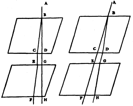I have also stated in the preceding demonstration that the movement of the piece A of the incident wave is not able to communicate itself beyond the plane AB, or at least not wholly. Whence it is to be remarked that though the movement of the ethereal matter might communicate itself partly to that of the reflecting body, this could in nothing alter the velocity of progression of the waves, on which [Pg 27]the angle of reflexion depends. For a slight percussion ought to generate waves as rapid as strong percussion in the same matter. This comes about from the property of bodies which act as springs, of which we have spoken above; namely that whether compressed little or much they recoil in equal times. Equally so in every reflexion of the light, against whatever body it may be, the angles of reflexion and incidence ought to be equal notwithstanding that the body might be of such a nature that it takes away a portion of the movement made by the incident light. And experiment shows that in fact there is no polished body the reflexion of which does not follow this rule.