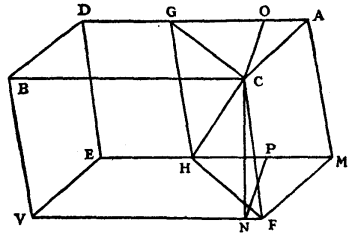 Mr. Bartholinus, in his treatise of this Crystal, puts at 101 degrees the obtuse angles of the faces, which I have stated to be 101 degrees 52 minutes. He states that he measured these angles directly on the crystal, which is difficult to do with ultimate exactitude, because the edges such as CA, CB, in this figure, are generally worn, and not quite straight. For more certainty, therefore, I preferred to measure actually the obtuse angle by which the faces [Pg 100]CBDA, CBVF, are inclined to one another, namely the angle OCN formed by drawing CN perpendicular to FV, and CO perpendicular to DA. This angle OCN I found to be 105 degrees; and its supplement CNP, to be 75 degrees, as it should be.