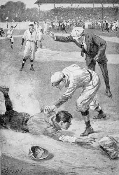 Sam’s shout was not necessary, nor the cries of the fielders, for Tom had already seen what was up. Hurriedly he stepped forward and sped the ball to the catcher, the batsman struck at it and missed, and the runner slid feet forward for the plate. Down swept Sam’s arm, but the runner was safe, one foot hooked into the plate and his body well out of reach. And on third the man from second danced and shouted in a cloud of dust!