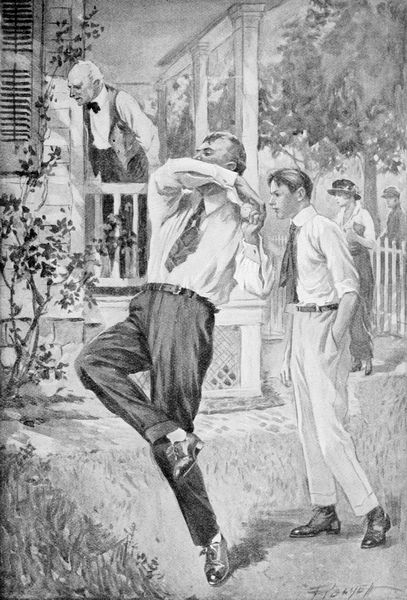 Saturday dawned breathlessly still and very hot, too hot to eat any breakfast, Tom decided. But Mr. George, who came to the table while Tom was still trifling with a piece of toast and a glass of milk, decided otherwise and made the boy eat two soft-boiled eggs. At the store Mr. Cummings fussed about him all the morning, taking work out of his hands and forever bidding him take things easy and not get tired. If Mr. Cummings could have had his way, Tom would have remained seated in an arm-chair in the office all the forenoon! The game was to begin at three-thirty instead of two-thirty in order to avoid as much of[309] the heat as possible. At luncheon Tom was much too restless and excited, too anxious, in fact, to eat without persuasion. Mr. George supplied the persuasion. After luncheon, seeing that his protégé was “up in the air,” to use his own expression, the detective took him into the side-yard and let him pitch three or four dozen balls leisurely in order to take his mind off the coming contest. Finally, when Mr. George had called a halt, and they were back in the shade of the porch, Tom asked the question that he had been eager to ask for days.