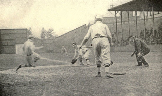 Roger Bresnahan is the same kind of a man. He thinks quickly, and is a brilliant player, but he never dodges anything. He is often hurt as a result. Once, when he was with the Giants, he was hit in the face with a pitched ball, and McGraw worried while he was laid up, for fear that it would make him bat shy. After he came back, he was just as friendly with the plate as ever. The injury of men like Chance and Bresnahan, whose services are of such vital importance to the “inside” play of a team, destroys the effectiveness of the club.