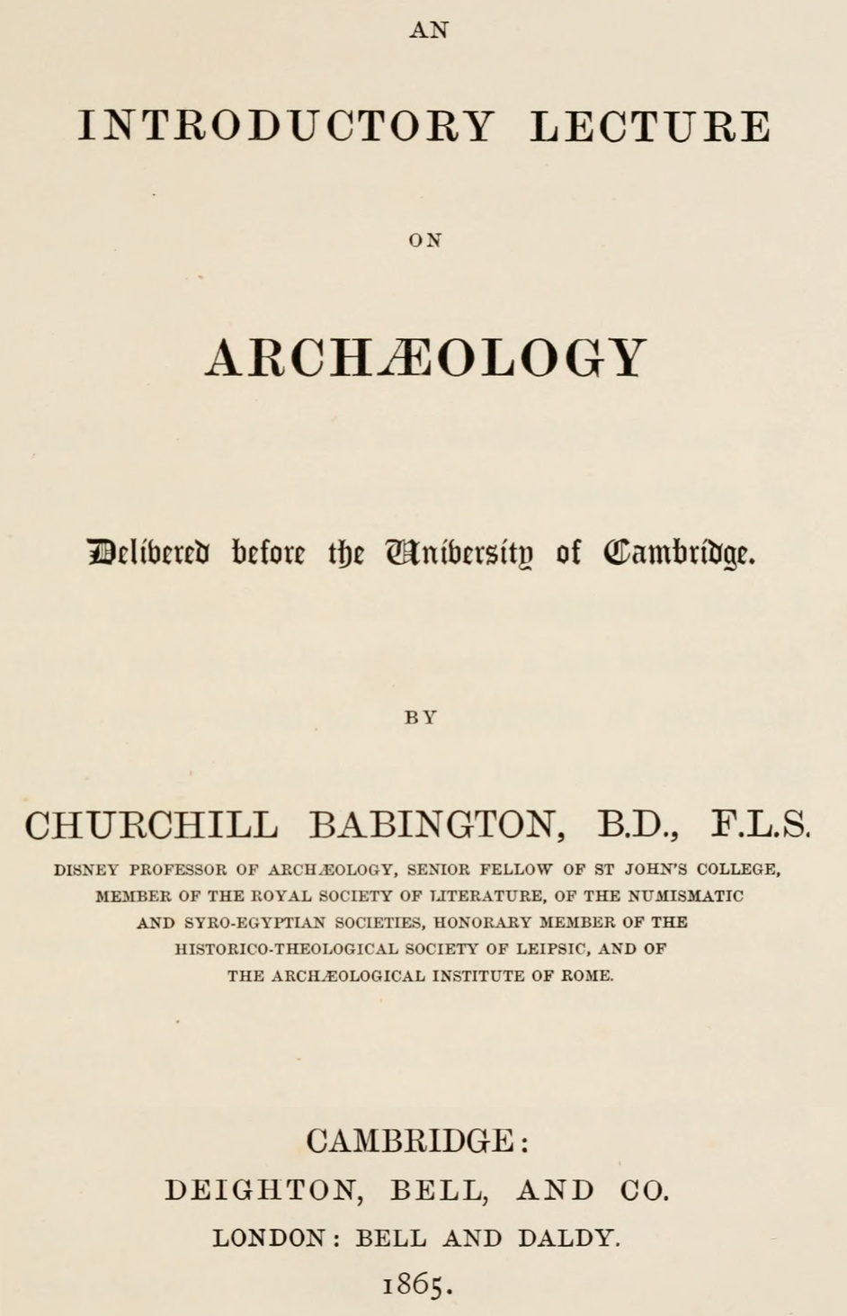 Following the example of my distinguished predecessor in the Disney Professorship of Archæology, I open my first Course of Lectures with an introductory Lecture on Archæology itself, so far as the very limited time for preparation has allowed me to attempt one.