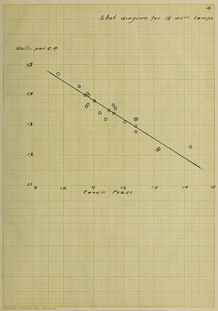 The lamps were rated at 1.31 watts per horizontal candle power and were supposed to have a useful life of 1000 hours. The voltage ratings of those obtained from the factory were 114 - 112 - 110 and those bought in open market were 115 - 113 - 111. The correct efficiency of the lamps as found by test was 1.34 watts per candle power. A shot diagram follows which shows the actual rating of the lamps at high efficiency.