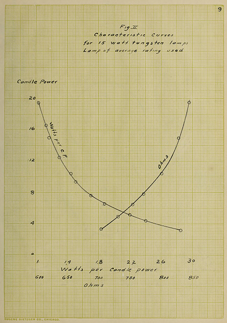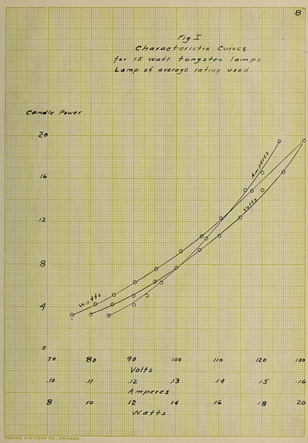 Figure 1, Page 8, shows the variations of the candle power with the voltage, current and watts. Figure II shows the relation between candle power and the efficiency, watts per horizontal candle power, and also the variation of the candle power with the resistance.