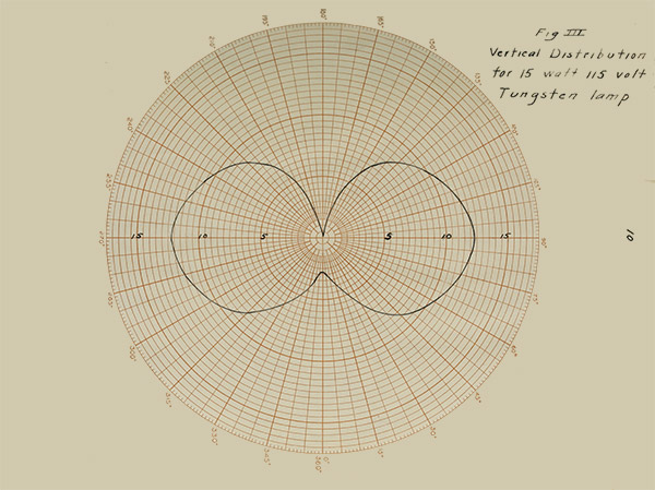 The horizontal distribution curve of a lamp with its filament mounted as is the modern tungsten is nearly a circle. This is not true, however, in the case of vertical distribution and this curve is shown, Figure III. As will be noted, the tip candle power is only about 23 per cent of the horizontal.