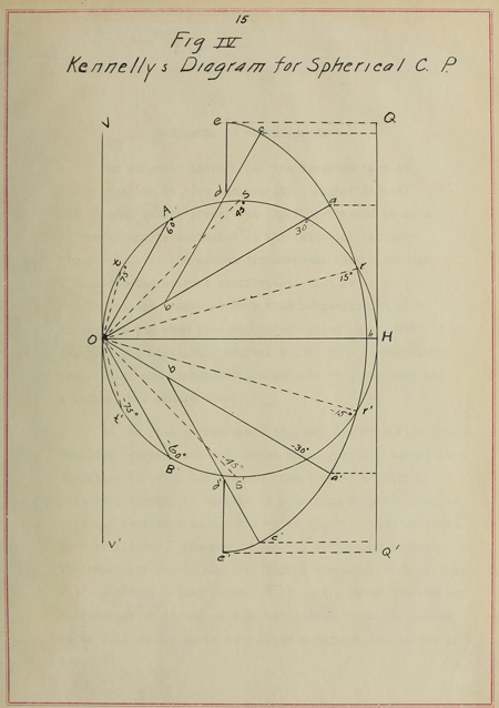 The arc ha´c´e´ is extended from the horizontal to the vertical beneath in the same manner as above by steps of 30° with centers O, b´, and d´, and radii Or´, OS´ and Ot´ respectively. The curve ecarr´a´c´e´ is now continuous and complete. A vertical line QQ´ is drawn through the convenient point H and the points e c a a´ c´ e´ are projected upon the same. The length HQ, is the upper hemispherical intensity and the length HQ´ the lower hemispherical intensity. Their arithmetical mean is the mean spherical intensity. Since in this case the upper and lower hemispheres are symmetrical HQ = HQ´ = QQ´/2 = mean spherical intensity. By measurement this half length is found to be 3.125 inches and from the scale used this corresponds to 9.67 candle power. The spherical reduction factor for these lamps is, then