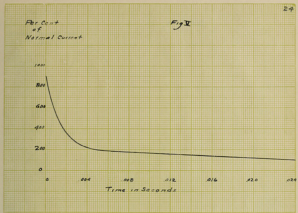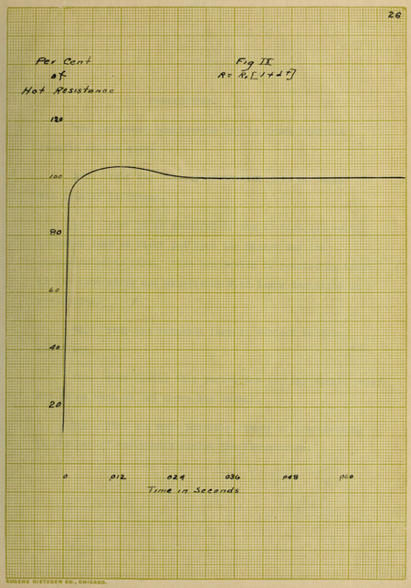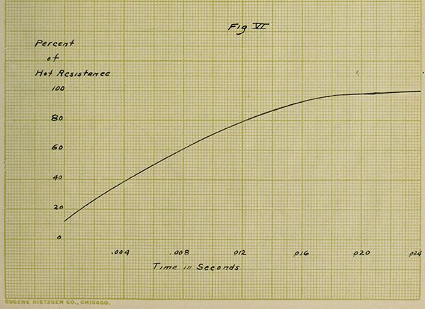 In order to prove that the law of resistances, namely, R = Ro(1 + αt) does not hold for the first instance after closing the switch on a tungsten lamp, the following curves have been plotted. Number V. has been taken from the oscillograph record shown in the first part of this paper and shows that about .024 second elapses before the current becomes normal. Knowing the current at any instant as given by this curve, it is easy to find the resistance at the same instant by Ohm's law, the electromotive force being a constant and known value. Curve VI shows this relation. Curves VII and VIII are approximate values and not absolute. Now from the temperature curve, values are taken and substituted in the formula for resistance, R = Ro(1 + αt), the resulting curve being Figure IX. It is seen that curves VI and IX do not take the same values at all until after a brief interval of time has elapsed. Curve VI is absolutely correct, however, as these values have been obtained from the oscillograph record. Consequently, the assumption upon which curve IX is based must be incorrect for the first .024th of a second and the conclusion is that the law of resistances does not hold. This result tends to strengthen the theory of the lag of resistivity for the “overshooting” of a tungsten lamp.