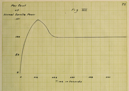 It is seen that number three compares favorably with the overshooting as shown by number two and the candle power corresponding was found to be approximately 50% greater than normal. It is not claimed that every lamp 22will overshoot this amount as the degree of vacuum or other factors of individual lamps may play an important part in this phenomenon. There is no doubt, however, that this strange fact really occurs and is not due to physiological reasons.