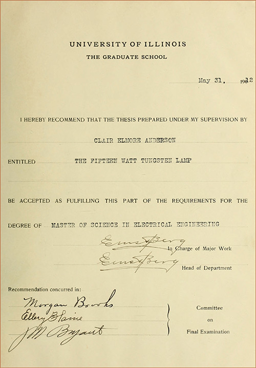 I HEREBY RECOMMEND THAT THE THESIS PREPARED UNDER MY SUPERVISION BY CLAIR ELMORE ANDERSON ENTITLED THE FIFTEEN WATT TUNGSTEN LAMP BE ACCEPTED AS FULFILLING THIS PART OF THE REQUIREMENTS FOR THE DEGREE OF MASTER OF SCIENCE IN ELECTRICAL ENGINEERING