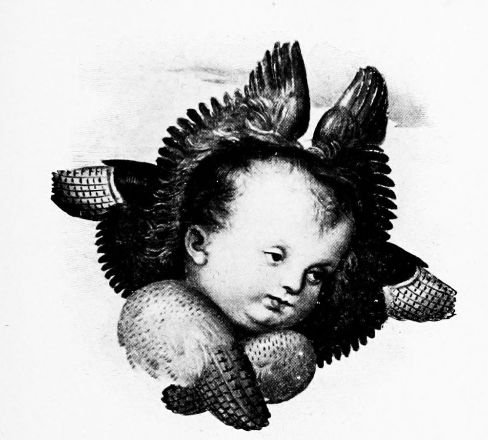 Angelic symbolism in its purity makes the “blue-eyed seraphim” and the “smiling cherubim” equally incorrect, since the{27} seraph should be glowing with divine love, and the face of the cherub should be expressive of serious meditation,—as Milton says, “the Cherub Contemplation.” The familiar cherubim beneath Raphael’s famous Madonna di San Sisto, in the Dresden Gallery, are exquisite illustrations of this thoughtfulness.