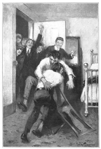 A mighty howl went up from the onlookers; it carried to the farthest corners of Gannett Hall,—and there was such a note of pure enjoyment and hilarious surprise in it that every son of Ridgley upon whose ears it fell wasted no time in abandoning whatever was at hand and dashing madly to the scene of combat. As Bassett struggled to his feet all the roomers in Gannett Hall began to converge on Teeny-bits' room, and by the time the Western Whirlwind had thrown off his coat and laid hold on his opponent again, they were crowding in at the door and craning their necks to get a view of the fracas.