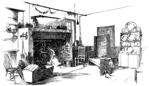 The kitchen was the centre of family life. Here a vast amount of work was done. Here they ate, spent their evenings, and commonly received visitors. Often it served as a sleeping-room besides. Its size was ample, though the ceiling was low and pretty sure to be crossed by a ponderous beam of the framework of the house, the lower half projecting from the plastering above. A few straight-backed chairs sat stiffly up against the wainscoted wall, and seemed to have an air of reserve that would change to surprise if one ventured to move or use them. There stood the dresser, with bright array of pewter, a small table, a bed turned up against the wall and hidden by curtains, a cradle, a stand, a great high-backed settle, and lastly, extending almost across one end of the room, was the most important feature of the kitchen, the fireplace.