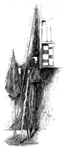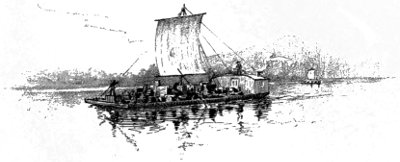 When an inland town was in the neighborhood of a navigable stream the heavier supplies, such as sugar, rum, and molasses, were brought up the river in big flat-boats. These boats were clumsy, square-ended affairs, with a narrow cabin across the stern just high enough for a man to stand up in, where were a couple of bunks and a rude stove. A big, square sail 13 on a thirty-foot mast moved the craft, but when the wind failed it was necessary to resort to poling. The helmsman had his post on the roof of the cabin, and he with one other man made up the crew. Sometimes they ate their meals on board, sometimes stopped at a village on the banks and went to the tavern. When darkness settled down they hitched somewhere along shore, but at times, when the wind was fair and the moon bright, would sail on all night.