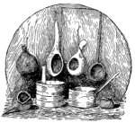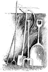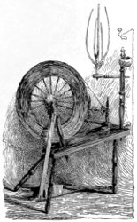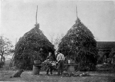 When the grain ripened, it was reaped by hand with the slender, saw-edged sickles. The peas and oats, which were sowed together, had to be mowed and gotten in; the flax had to be pulled and rotted; there was hoeing to be done, and the summer was full of work. In the fall the corn had to be cut and husked and the stalks brought in, the pumpkins and squashes gathered, potatoes dug, the haying finished, and the apples picked. Most farms had large orchards about them, and many barrels of apples were stowed away in the cellar, but the larger part was made into cider. There would usually be several little cider-mills in a town, whose creaking machinery could be heard on many a cool autumn day groaning under its labors. The shaking of the apple-trees and carting the fruit to mill, and the taking 17 copious draughts of the sweet liquid through a straw from the tub that received it from the press, and then the return with the full barrels—all this had more of the frolic in it than real work, particularly for the boys. The sweet apples, in large part, were run through the mill by themselves, and the cider was boiled down at home into a thick fluid known as apple-molasses, used for sweetening pies, sauce, and puddings. When harvesting was done, the cellar was full of vegetables in barrels and bins and heaps, and heavy casks of cider lined the walls, and little space was left for passageways. Even in broad daylight it was a place mysterious, gloomy, and dungeon-like; yet its very fulness which made it thus was suggestive of good cheer.