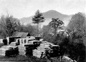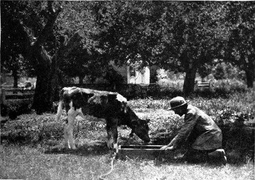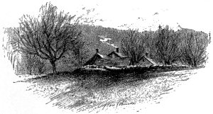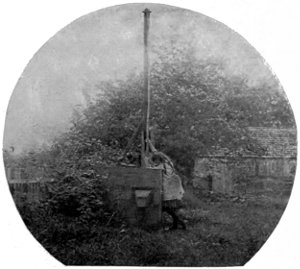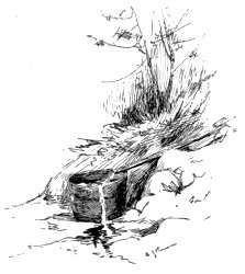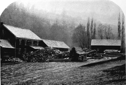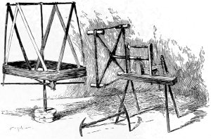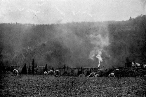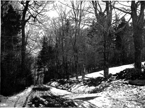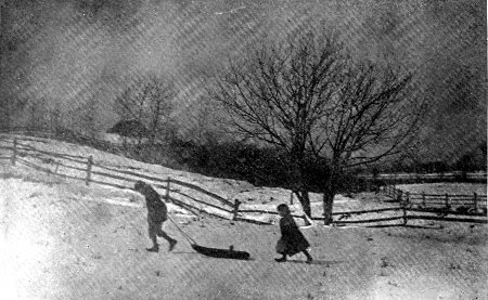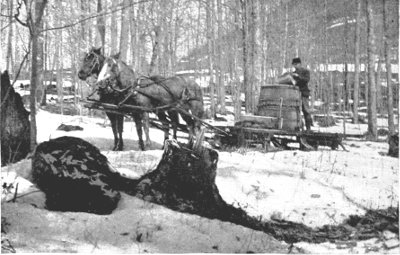 In the earliest days of spring, if the farm had a maple orchard within its borders, there were trees to tap, and sap to gather and boil down. The snow still lay deep in the woods where the maples grew, and the sap-gathering was done with an ox-sled on which was set a huge cask. In some sheltered nook of the woods a big kettle was swung over an open-air fire, and the boiling-down process commenced.