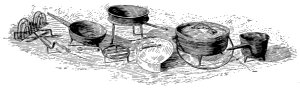 Some of the older girls, perhaps grandma or the mother also, soon take their wooden pails and go to the barn to milk the cows. When they returned, they strained the milk through cloths held over the tops of the pails into the brown earthen pans, and then were ready to help with the breakfast preparations. A second kettle has been hung from the crane, in which potatoes are boiling. Coals have been raked out on the hearth, and over them is set a long-legged spider on which slices of pork are sizzling.