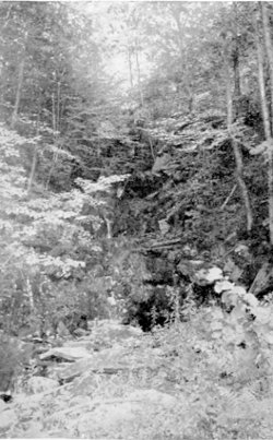 The campers with their spade went through the strip of woods La Fay had indicated, and found a pretty bit of pasture beyond. The falls were in plain hearing in the ravine below, and they found a little level just suited for the tent, and not far away a fine spring of clear, cold water. Lastly, they noticed that one corner of the lot was a briery tangle of blackberry vines that hung heavy with ripe berries. This they thought an undoubted paradise—every delight at their tent door. First they ate their fill of berries, and then went down into the hollow. The bed of the stream was strewn with great bowlders. Around towered the full-leaved trees. A little above was the fall, making its long tumble down a narrow cleft of the rocky wall.