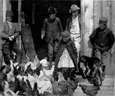 It is lighter now. The tea-kettle recovers from its ill-humor, and, half asleep, sings through its nose a droning song of contentment and sends up the chimney quite a little cloud of steam. Now the woman of the family 24 has appeared and bustles about getting breakfast. She calls the children at the chamber door. Down they come, and crowd about the fire or scrub themselves in the wash-basin on the table. Grandfather is up, and he and the older boys go out-doors. Grandma helps the smaller children fasten their clothes and wash their faces, and assists about the housework.