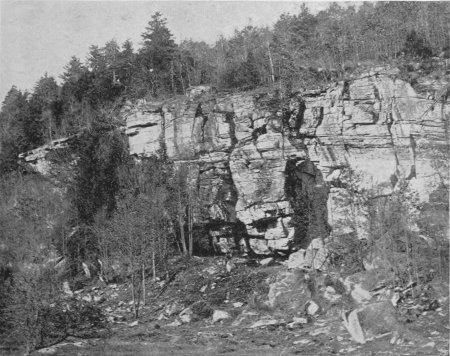 “Good!” said John; and after breakfast our campers went down to the mill, which, with the placid pond above, was completely closed in by the green masses of the forest. It was a gray little building, with mossy shingles, and broken windows and doors. There were boards missing here and there from its sides, and it was so old and rude it seemed a wonder it did not slide down the precipice it half overhung. It had not been used for some time—that was plain. Below it was a steep, irregular fall of rocks over which thin streams of water were tumbling. Across the ravine, at the summit of the cliff, was a low dam; but it leaked badly, and the water did not reach its top by some inches. Midway in the stream, at the dam, was a rocky island where grew a few stunted pines. A foot-bridge crossed to it from a lower door of the mill. Thus it was necessary to climb to the top of the island cliff, where another bridge swung high up over the narrow ravine to the farther shore.