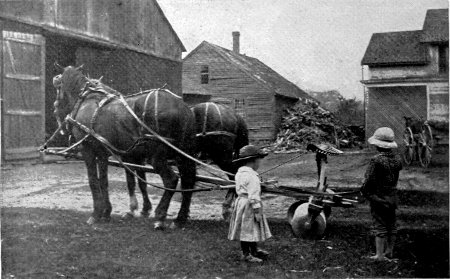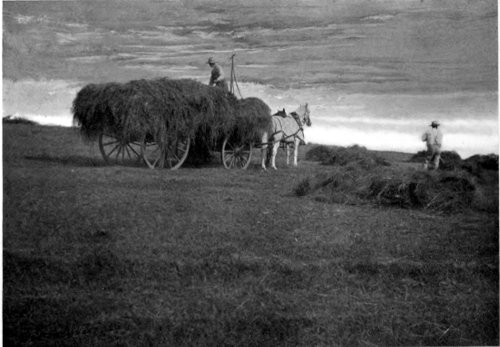 Oxen did most of the heavy farm-work, such as ploughing and hauling, and it was not till after 1825 that horses became more general. The common cart which then answered in the place of our two-horse wagon was a huge two-wheeled affair having usually a heavy box body on the “ex.” But when used in haying, the sides of the box were removed and long stakes were substituted.