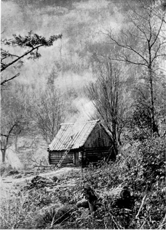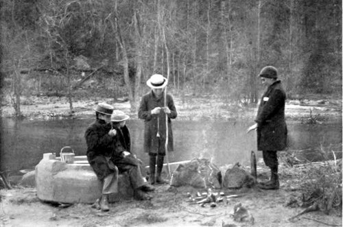 A fire was burning in the stove, and the campers hung their wet overcoats behind it, and themselves drew chairs to the stove and sat with their feet on the hearth. On the table was a pile of unwashed dishes. From the large room next to the kitchen came the sound of dripping water. There was a great pool on the floor in one place, and two or three pans were set about to catch the streams trickling through the ceiling.