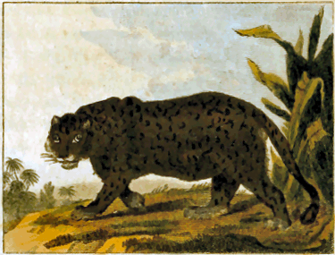 In the preceding article we have seen that the lion exists not in America, and that the puma of Peru is an animal of a different species; and we shall now find that the tiger and panther belong also to the old continent, and that the animals of South America, to whom those names have been applied, are also different. The real tiger is a terrible animal, and more, perhaps, to be dreaded than the lion himself. His ferocity is beyond comparison; but an idea of his strength may be drawn from his size; he is generally from four to five feet high, and from nine to fourteen in length, without including his tail; his skin is not covered with round spots, but with black stripes upon a yellow ground, which extend [7] across the body, and form rings from one end of the tail to the other. These characteristics alone are sufficient to distinguish him from all the animals of prey belonging to the new continent, as the largest of them scarcely ever exceed the size of our mastiffs. The leopard and panther of Africa and Asia, though much smaller than the tiger, are larger than the rapacious animals of South America. Pliny, whose testimony cannot be doubted (since panthers were daily exposed, in his time, at the theatres in Rome), indicates their essential characteristics, by saying, their hair is whitish, diversified throughout with black spots, like eyes, and that the only difference between the male and female were the superior whiteness of her hair.