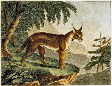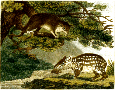 The American animals, which have been called tigers, have a greater resemblance to the panther, and yet their difference from that species is very evident. The first is the Jaguara, or Janowra, a native of Guiana, Brasil, and other parts of South America. Ray, with some propriety, calls the animal the Pard, or Brasilian lynx. The Portuguese call him Ounce, because they had first, by corruption, given that name to the lynx, and afterwards to the small panther of India; and the French, without his having the smallest affinity, have [8] called him tiger. He differs from the panther in size, in the position and figure of the spots, in the colour and length of the hair, which is frizzled when young, and never so straight as that of the panther, differing also in disposition, being more savage, and cannot be tamed; still, however, the jaguar of Brasil resembles the panther more than any other animal of the new world. The second we call Cougar, by contracting the Brasilian name cougouacou-ara, and which the French, with still less propriety, have called the Red Tiger. From the real tiger it differs in all, and from the panther in most respects, its hair being red, and without spots; and in the form of its head, and length of his muzzle, it differs also from them both. A third species, which has also been called tiger, though equally remote, is the Jaguarette, which is nearly of the size of the jaguar, and resembles him in natural habits, but differs in some exterior characters. He has been called black tiger, because his hair is black, interspersed with spots of a still blacker hue. Besides these three species, and perhaps a fourth, which is smaller, that have been named after the tiger, there is another American animal, which appears to have a greater right to it, namely, the Cat-pard, or mountain cat, which resembles both the cat and the panther. Though smaller than [9] either of the above three animals, it is larger than the wild cat, which it resembles in figure, but its tail is much shorter, and it differs also by having its hair diversified with black spots, long upon the back and round upon the belly. These four American animals have, therefore, very improperly been named tigers. The cougar and cat-pard I have seen alive, and am convinced they are of different species, and still more so from the tiger or panther; and as for the puma and jaguar, it is evident, from the testimony of those who have seen them, that the former is not a lion, nor the latter a tiger, and therefore, without scruple, we may pronounce, that neither the lion, tiger, nor even the panther, exist in America, any more than the elephant, rhinoceros, hippopotamus, camel, or the camelopard. All these species require a hot climate for propagation, and as none of them exist in the northern regions, it is impossible they should have had any communication with America. This general fact is too important not to be supported by every proof; we shall, therefore, continue our comparative enumeration of the animals of the old continent with those of the new.