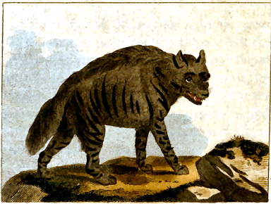 The Hyæna, which is nearly the size of the wolf, was known to the ancients, and I have myself seen a living one. It is remarkable for having an opening between the anus and tail, like the badger, and from which issues a humour that has a strong smell; also for a long bristly mane which runs along its neck; and for a voracity which prompts it to scrape up graves and devour the most putrid bodies.