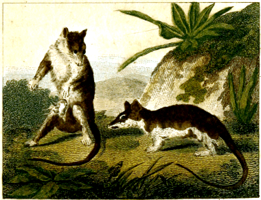 THE opossum is an animal of America, which is easily distinguished from all others by two singular characters; first, the female has under the belly a large cavity where she receives [230] and suckles her young; secondly, both male and female have no claws on the great toes of the hind feet, which is separated from the others, as the thumb on the human hand, whilst all the other toes are armed with crooked claws, like the feet of other quadrupeds. The first of these characters has been observed by most travellers and naturalists, but the second had escaped their observation. Edward Tyson, an English physician, seems to be the first who made this remark; and he only has given a good description of the female in a treatise printed in London in 1698, under the title of The Anatomy of an Opossum. Some years after, W. Cooper, a celebrated English anatomist, communicated to Tyson the observations which he had made Upon the male. Other authors, and especially the nomenclators, who have multiplied beings without necessity, have here fallen into numerous errors respecting this animal.