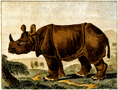 The rhinoceros feeds upon coarse herbs, such as thistles and prickly shrubs, and he prefers this wild food to the sweet pasture of the verdant meadows. He is fond of sugar canes, and eats also all sorts of corn. Having no taste for flesh, he neither molests small animals, nor fears the large ones, but lives in peace with them all, not excepting the tiger, who often accompanies, without daring to attack him; therefore, I doubt, whether the battles betwixt the elephant and rhinoceros, have any foundation; [335] they must at least be seldom, since there is no motive for war on either side; and, besides, no sort of antipathy has been observed between these animals. Some even in captivity have lived quietly together, without giving offence or provocation. Pliny is, I believe, the first who has mentioned these battles betwixt the rhinoceros and elephant. It seems they were compelled to fight in the spectacles at Rome, and, probably from thence the idea has been taken, that when in their natural state they fought as desperately; but every action without a motive is unnatural; it is an effect without a cause, which cannot happen but by chance.