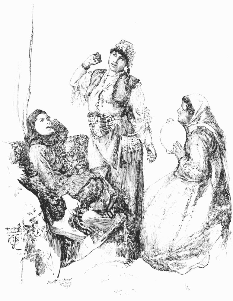 With this enumeration my statement that he is handsome may not appear to accord. Nevertheless, he is a good-looking fellow; his spare form is often tall, the quickly turning eyes are wonderfully brilliant, the dark face is lighted by the gleam of white teeth, the gait is very graceful, the step light. The Albanian costume, which was adopted after the revolution as the national dress for the whole country, is amazing. We have all seen it in paintings and photographs, where it is merely picturesque. But when you meet it in the streets every day, when you see the wearer of it engaged in cooking his dinner, in cleaning fish, in driving a cart, in carrying a hod, or hanging out clothes on a line, then it becomes perfectly fantastic. The climax of my own impressions about it was reached, I think, a little later, at Athens, when I beheld the guards walking their beats before the King's palace, and before the simple house of the Crown Prince opposite; they are soldiers of the regular army, and they held their muskets with military precision as they marched to and fro, attired in ordinary overcoats (it happened to be a rainy day) over the puffed-out white skirts of a ballet-dancer. Robert Louis Stevenson, in one of his recent letters from the South Seas, writes that "the mind of the female missionary" (British) "tends to be constantly busied about dress; she can be taught with extreme difficulty to think any costume decent but that to which she grew accustomed on Clapham Common, and, to gratify this prejudice, the native is put to useless expense." And here it occurs to me that it is high time to explore this Clapham Common. We go as worshippers to Shakespeare's Avon; we go to the land of Scott and Burns; we know the "stripling Thames at Bablockhithe," where "the punt's rope chops round"; but to Clapham Common we make, I think, no pilgrimages, although it has as clearly marked a place in English literature as the Land of Beulah or the Slough of Despond. I fancy that Americans are not so closely tied to a fixed standard in dress as are the missionaries who excite Mr. Stevenson's wrath. A half of our population seeks its ideal in Paris, but as a whole we are easy-going. We accept the Chinese attire in our streets without demur; the lack of attire of the Sioux does not disconcert us; when abroad we admire impartially the Egyptian gown and the Cossack uniform, and we adorn ourselves liberally with the fez. But the Greek costume makes us pause; it seems a bravado in whimsicality. One can describe it in detail: one can say that it consists of a cap with a long tassel, a full white shirt, an embroidered jacket with open sleeves, a tight girdle, the white kilt or fustanella, long leggings with bright-colored garters, and, usually, shoes with turned-up toes. The enumeration, however, does not do away with the one general impression of men striding about in short white ballet petticoats.