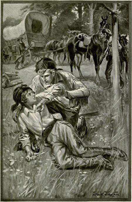 From behind an oak an Indian stepped out, raising his right hand, palm forward, as he came. In the hollow of his left arm he carried a heavy rifle. Fastened in his scalp-lock were feathers of the white-headed eagle, showing that he was a chief.