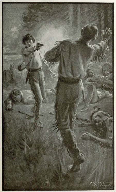 Jack glanced neither to the right nor to the left. His eyes were fixed only on his foe. For an instant the roar of battle rose around him. Rifles flashed in his face. Men struck at him with sabers and clubbed guns. Then he was out of the ruck, crashing through the autumn woods. Saplings lashed at him with stinging strokes. Low-hung branches scraped his horse’s back, dragging at him. Thickets, seemingly impassable, broke before the impetus of[322] his rush. Then, abruptly the roar of battle died away. The flickering rifle flames vanished.