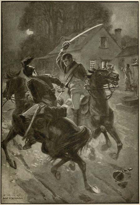 But the Englishman did not pause. His onslaught became terrible. His sword became a living flame, circling, writhing, and hissing in the moonlight. Slowly he forced the American backward. For the moment no living man could have held ground against his fury.