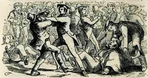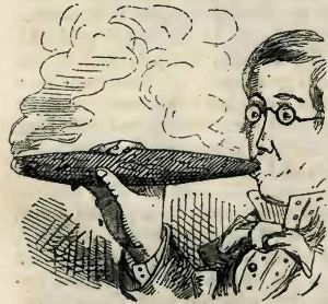 "I'll bet you a bottle of blacking, Giglamps," said little Mr. Bouncer, as he directed our hero's attention to the stranger, "that this respected party is an intending Freshman. Look at his customary suits of solemn black, as Othello, or Hamlet, or some other swell, says in Shakspeare. And, besides his black go-to-meeting bags, please to observe," continued the little gentleman, in the tone of a wax-work showman; "please to hobserve the pecooliarity hof the hair-chain, likewise the straps of the period. Look! he's coming this way. Giglamps, I vote we take a rise out of the youth. Hem! Good morning! Can we have the pleasure of assisting you in anything."