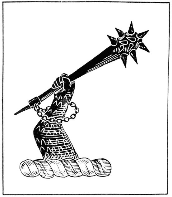 The arms of Ulster are a red left hand appaumé on a silver ground, and the origin of this curious coat is said to be that on an Irish expedition for the acquisition of new territory in ancient days, the ancestor of the O'Neiles, finding that an adversary was reaching the coveted shore more quickly than he was, cut off his left hand, and threw it ashore, thereby establishing a "first landing" claim to the new territory. The claim was allowed, and so the successful chieftain became the first king of Ulster and the ancestor of the succeeding kings.