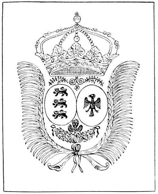 When a man quarters the coat-of-arms of an ancestral heiress, he has also the right to use the crest belonging to it. The right of bearing a crest, although not allowed to ladies, seems to be latent in them, as it can be inherited through them, if heiresses, by their male descendants. But in ordinary English usage it is usual[Pg 9] only to use one crest, except in the case of an assumption by Royal Licence of an additional surname, coat-of-arms, and crest. In German heraldry such quartered coats are usually accompanied by all their respective crests, which are placed along the top of the coat in an arched line, each on its proper helmet, and all facing inwards.
