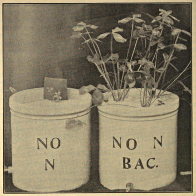 That clover has no power in itself to gather atmospheric nitrogen, and that the bacteria do have power to feed the clover plant with nitrogen gathered from the air is very easy to demonstrate. It is one of the regular laboratory practices of the students in soil fertility in the Agricultural College to make this demonstration. Plate 1 is an illustration of such student work. The two pots which are shown were provided with all elements of plant food, excepting the one element nitrogen. Thus far the two pots are exactly alike. Each contains no nitrogen, as indicated by the label “No N.” Each pot is planted with the same number of red clover seeds. To the right-hand pot, however, some bacteria (“Bac.”) were added, while none were added to the left-hand pot. These bacteria were obtained by taking about one pound of soil from a clover-field where abundance of tubercles were found on the[312] clover roots, adding this soil to about one quart of pure water, shaking for a few minutes, allowing the soil to settle, then taking a small quantity of almost clear solution, and adding it to the pot which we wished to inoculate with the red clover bacteria. Aside from the addition of these microscopic bacteria to the right-hand pot, these two pots were treated exactly alike throughout the experiment. It will be plainly seen that where the bacteria were added the clover was furnished with sufficient nitrogen to make a strong and luxuriant growth, while without the bacteria the clover (in the left-hand pot) only germinated and made what little growth it could with the small amount of nitrogen contained in the seed. This result is the difference between success and failure of the clover crop.