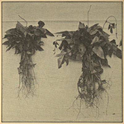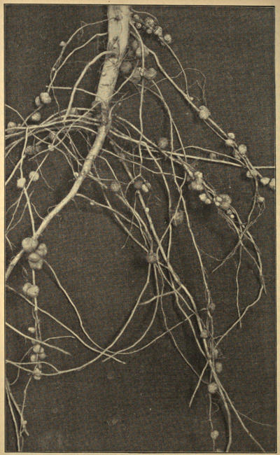 [5] There are some noteworthy exceptions to this rule (see following pages for illustration), and there is some evidence that, by a comparatively long process of breeding, or evolution, the bacteria which naturally live upon one kind of legume may gradually develop the power to live upon a distinctly different legume to which they were not at first adapted. Of course this process of forcing bacteria to live upon a legume to which they are not naturally adapted has little or no practical value because it is unnecessary if there is a species of bacteria which naturally lives upon the same legume. On the other hand, if, by any such process of breeding, or evolution, a species of nitrogen-gathering bacteria could be developed which could live on a non-leguminous plant, as corn, for example, it would be of incalculable practical value. As yet the efforts of bacteriologists, working on this problem, have given only negative results, so far as known to the writer.