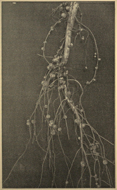 It is often stated that leguminous plants, such as clover, have power to obtain free nitrogen from the air. This is not strictly true. Red clover, for example, has no power in itself to get nitrogen from the air. It is true, however, that the microscopic organisms[3] which commonly live in tubercles upon the roots of the clover plant do have the power to take free nitrogen from the air and cause it to unite with other elements to form compounds suitable for plant food. The clover plant then draws[310] upon this combined nitrogen in the root tubercles, and makes use of it in its own growth, both in the tops and in the roots of the plant.