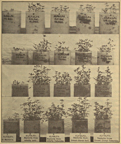 The infected alfalfa soil was obtained from a field of three-year-old alfalfa, which was inoculated when first seeded, with infected alfalfa soil obtained from an old alfalfa field in Kansas. About one pound of this soil was shaken in a quart of water, the soil allowed to settle, and some of the nearly clear solution used for the inoculation of Pot No. 2. The alfalfa tubercles from which bacteria were obtained were carefully washed in distilled water to free them from adhering soil particles, and then rubbed up in distilled water, a small amount of this water being then used for the inoculation of Pot No. 3. The infected sweet clover soil was obtained from a place by the roadside where sweet clover was growing luxuriantly and well provided with root tubercles. This place was about two miles from the nearest field ever seeded to alfalfa, so far as known. A water extract from this soil was used to inoculate Pot No. 4. The bacteria from sweet clover tubercles were obtained in the same manner as those from alfalfa tubercles, and were used to inoculate Pot No. 5.