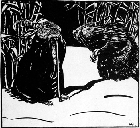 Wolf trotting along like a little horse, and Rabbit laughing