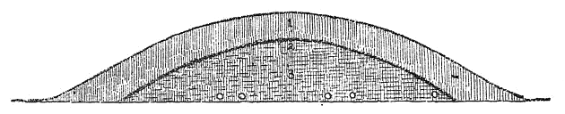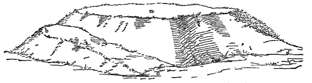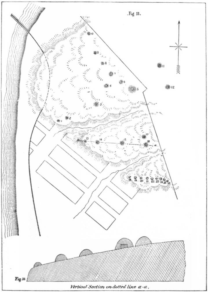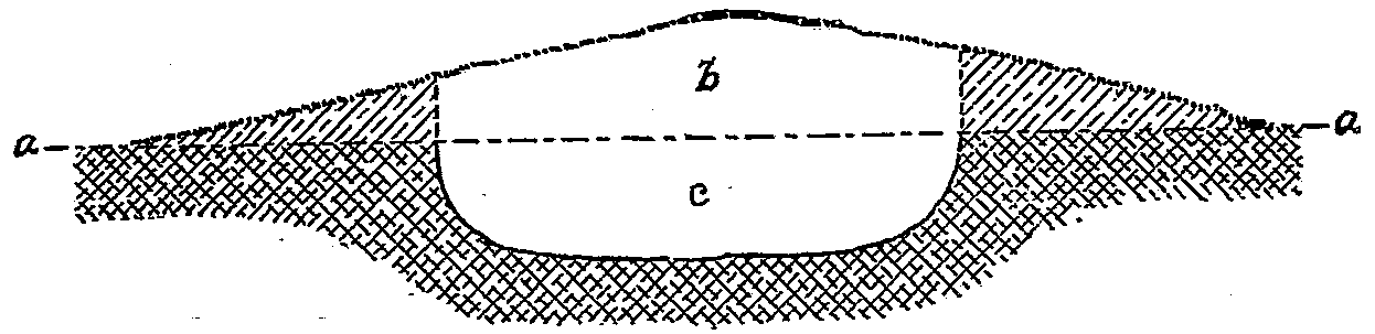 The one numbered 16, of the Courtois group, is about 20 feet in diameter, and at present scarcely more than 1 foot high, the ground having been in cultivation for several years and the mound considerably lowered by the plow. A vertical section is given in Fig. 2, a a, indicating the natural surface of the ground, b the part of the mound removed, and c the original circular excavation in the natural soil to the depth of 2 feet.